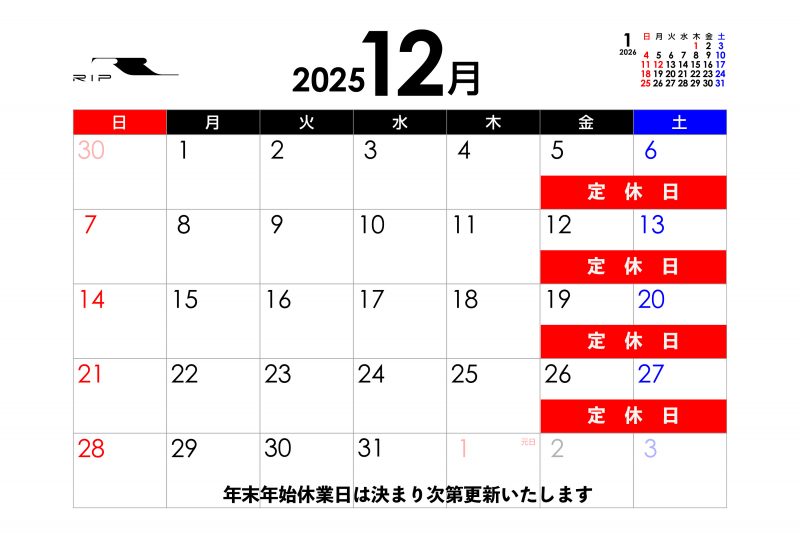 〇年末年始休業日 2024年12月27日(金)~2025年1月4日(土) 1月5日(日)から通常営業。 ご迷惑をおかけしますが、よろしくお願いいたします。