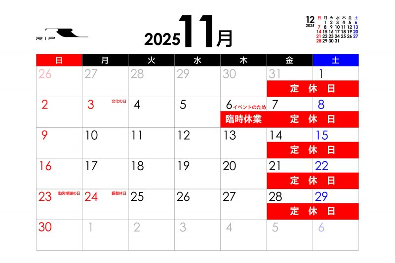 11月6日(木)は社内イベントのため、臨時休業とさせて頂きます。 7日、8日は定休日となりますので、9日(日)より通常営業となります。 ご迷惑をお掛け致しますが、何卒よろしくお願いいたします。