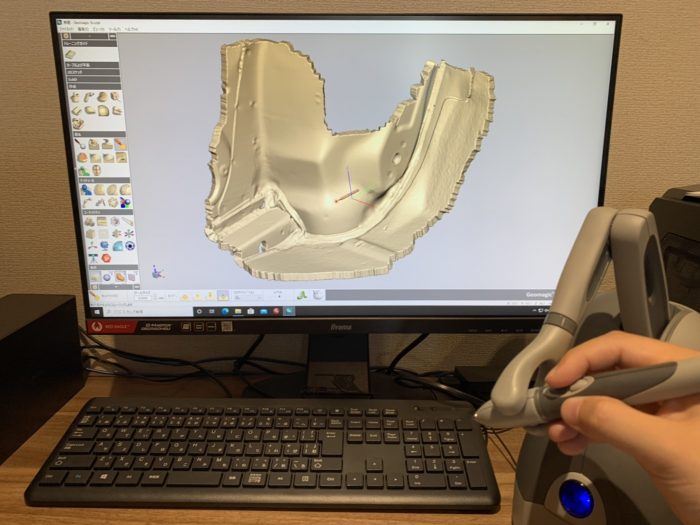 今回は通常の鈑金修理ではなく、3Dスキャナーとプリンターを活用して、穴にピッタリはまるパーツを作ってしまい、それを鈑金用ボンド、パテ等で固定して修復するというRIP初の試みです。