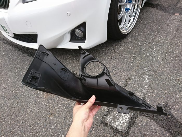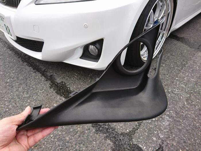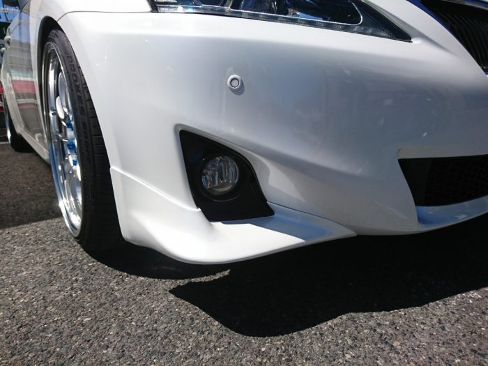 フロントリップは海外から輸入された純正IS-F風、左右2分割のリップスポイラー。フォグランプベゼルと一体になっています。