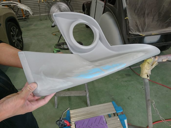 海外製ということで、フィッティングはイマイチ。 バンパーに沿うように削ったり、盛ったり加工して、サフェーサーの段階まで来ました。