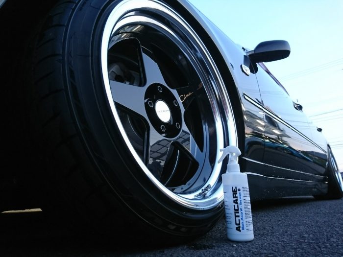 ブラックのホイールですと、ホイールのディテールが判りづらくなるのですが、Cimaのロゴステッカーを特注製作、アクセントを付けました。 ホイールナットもナットの頭がスポーク面とツライチになるよう寸法を計測し、ワークのビレットナット、全長48mmタイプを選びました。 仕上げのタイヤワックスはACTICARE。 自然なしっとりとした仕上がりのBlack Moist Wをチョイス。