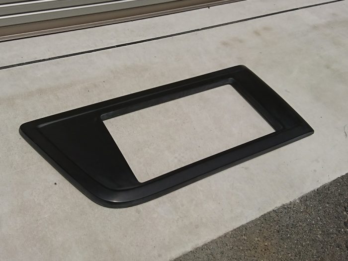 商品自体はこんな感じ。 黒ゲル仕上げのFRP製の窓枠です。 ハイエース・スーパーロングのスライドドアのガラスを外し、そこにフレームをはめ込み、市販の押し出しアクリルウインドウ、D-Luxの800x400mmを装着することができます。