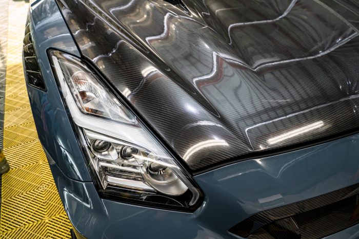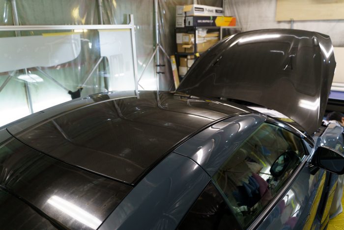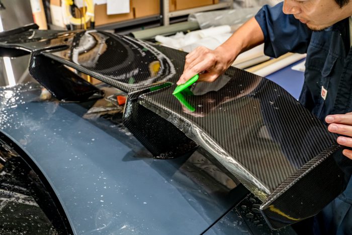 今回は、ボンネット、ルーフ、サイドスポイラー、リアバンパー、GTウイングなど、カーボンパーツをメインに、定番のフロントバンパー、ヘッドライトにプロテクションフィルムを貼らせていただきました。