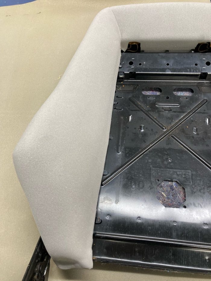 元の生地にとても似た生地を使って張り替えるので、修理後のシートの雰囲気が変わる事なく張り替え完了です。