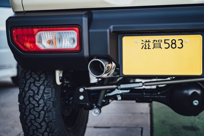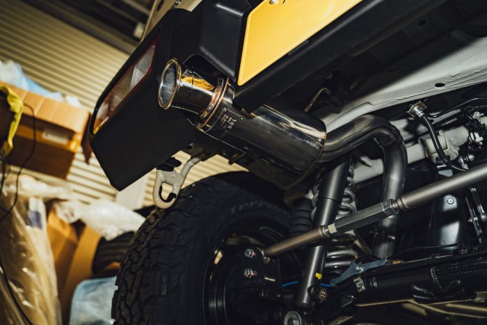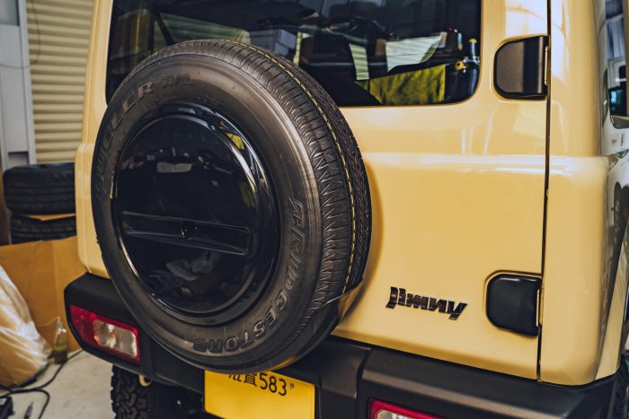 今回のカスタムの内容は、リフトアップ、タイヤ&ホイール、マフラー、フロントバンパーの交換、そして背面スペアタイヤの取り外しです。