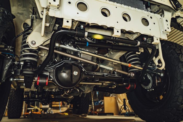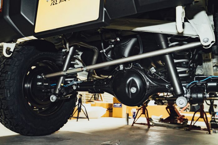 3インチアップのスプリングと、それに合わせたショックアブソーバー、ロングブレーキホース、調整式ラテラルロッド、バンプストップ、スタビ延長ブロック、プロペラシャフトスペーサーがセットになったショウワガレージの「Bキット」と呼ばれるリフトアップキットを装着します。
