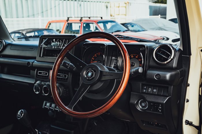 ステアリングホイールはナルディのウッドに交換。 見た目も美しく、無骨なジムニーの内装にも似合いますね!