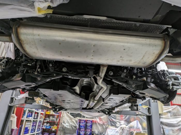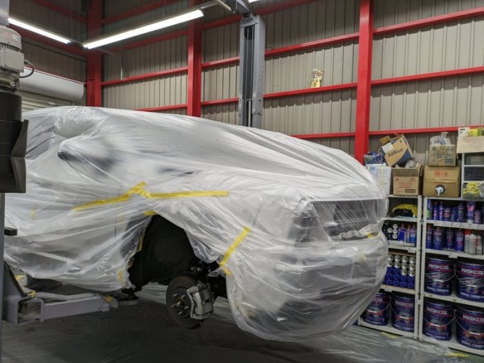 下回り防錆作業前に、車体全体を養生していきまして、下回りも汚れなどをおとしてからの作業になります。