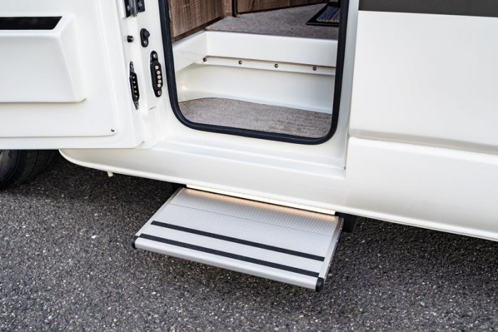 今回はドアの開閉に合わせステップが自動的にスライドする、オプションのドア連動キットとLEDランプも併せて装着しており、大変便利、且つ贅沢な空間を演出できます。
