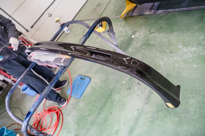 製品はウェットカーボンで、クリア塗装のみ施して装着するのが一般的ですが、今回はオーナー様の意向によりボディ同色に塗装します。