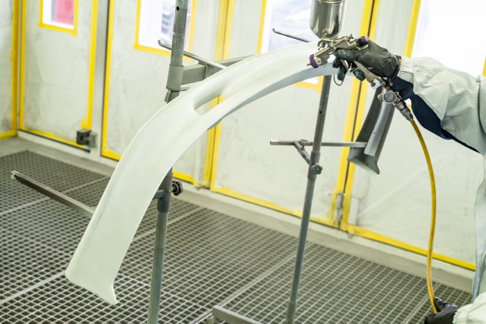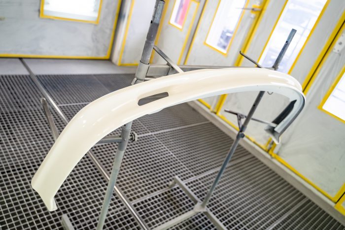 きっちりと足付け作業をし、サフェーサーを塗布して均した後、ボディ同色の塗装です。