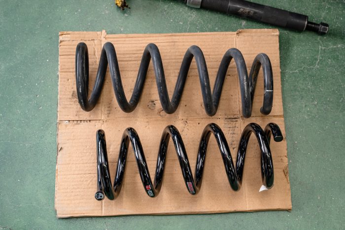 純正と比較すると、一巻きほど短い感じです。 フロントのダウン量は約40mm。