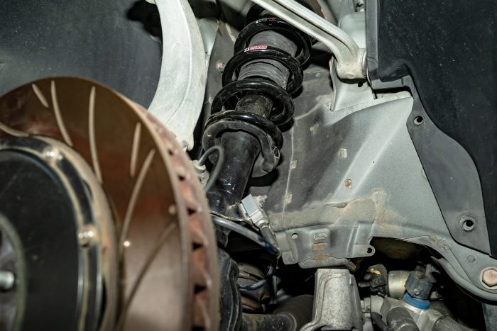 ホイールの向こうに見えているのは、ROTORAのビッグブレーキキットで、フロント6、リア4ピストン。