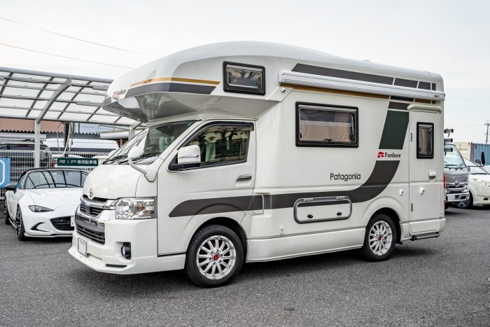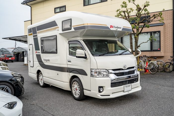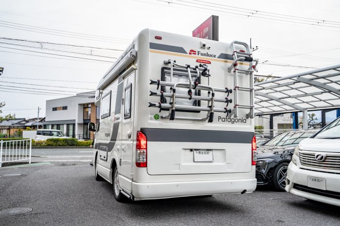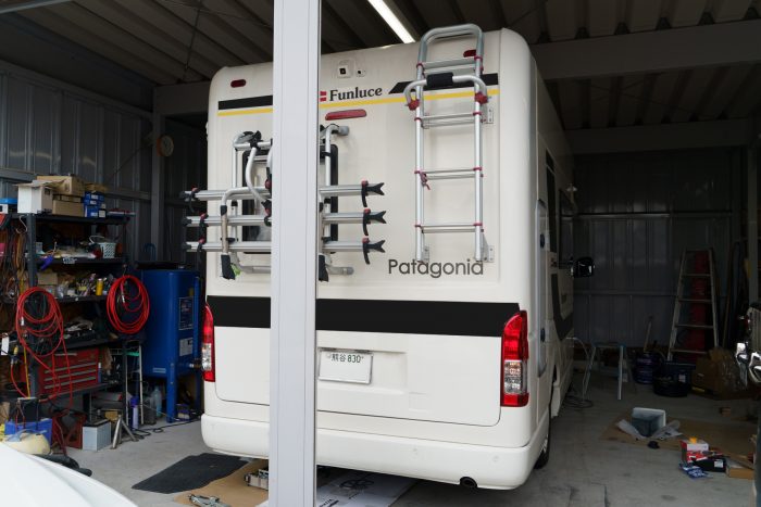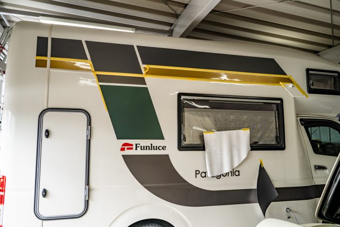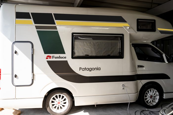 パタゴニアには、ファンルーチェ純正の大きなサイドデカールが貼られていますが、今回は車体上部やリアの白いスペースにデカールを追加して、キャンプサイトで映えるデザインにいたします。