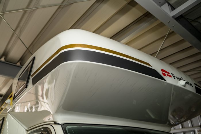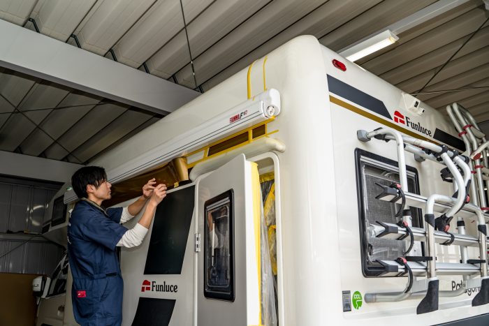 キャンピングカーは、白いスペースが多いので、こういったデカールを少し追加するだけで、イメージが大きく変わります。