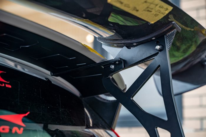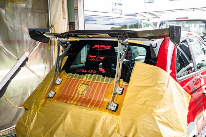 70 ANNIVERSARIOのアイコンである、角度調整機能付き純正ルーフスポイラーを残しつつ、空力的にもルックス的にも最適なポジションにウイングを取り付けるべく、位置や角度を調整します。