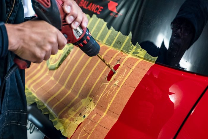 取り付け位置が決まり、リアゲートにステーを取り付けるための穴を開けます。