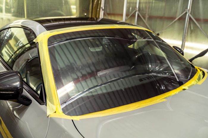 まずフロントガラスにウィンドウプロテクションフィルム (WPF)の『FRONTIER』を施工いたします。