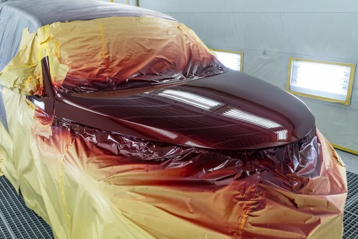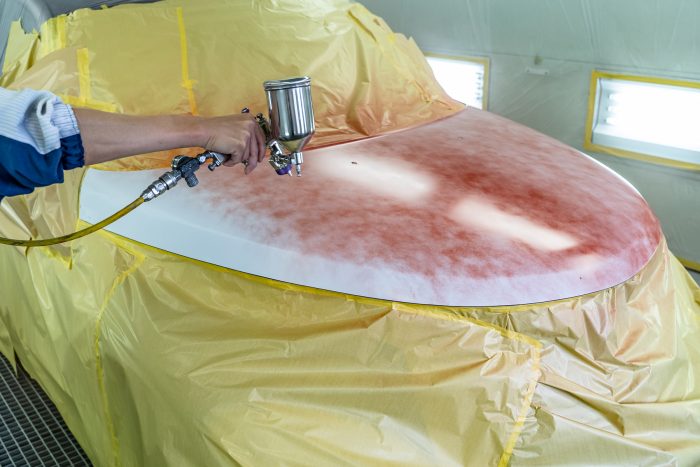 ボディーに試し吹きした塗り板を貼り、様々な角度から確認し、同じ色になるよう微調整を繰り返して色を作っていきます。