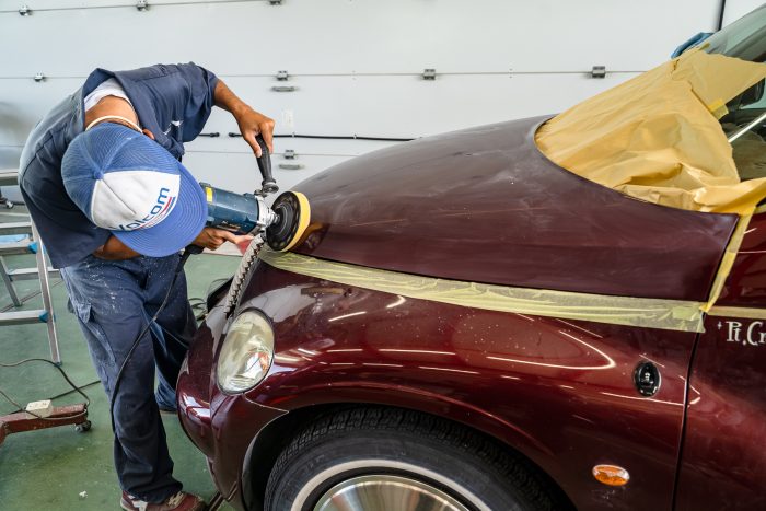また、小傷やヘコミを鈑金作業で修理し、パテを薄く塗って固まったら、自然な仕上がりになるように研いで成形します。