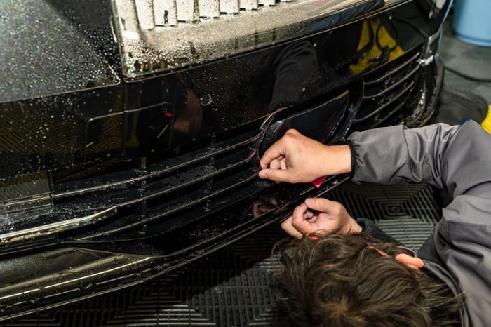 次にヘッドライトやフロントバンパーなど、フロント周りに貼っていきます。