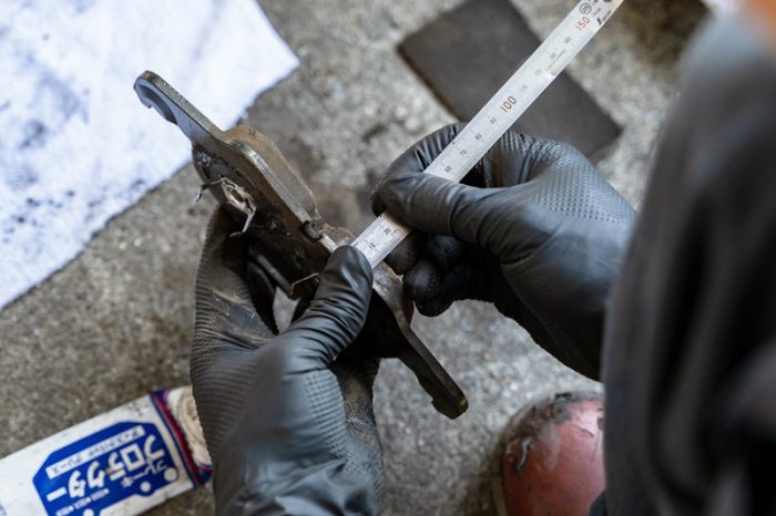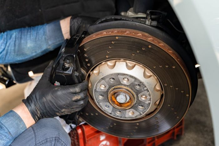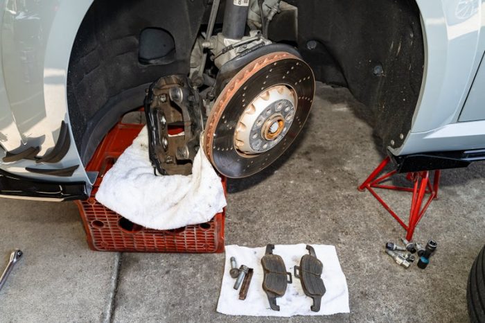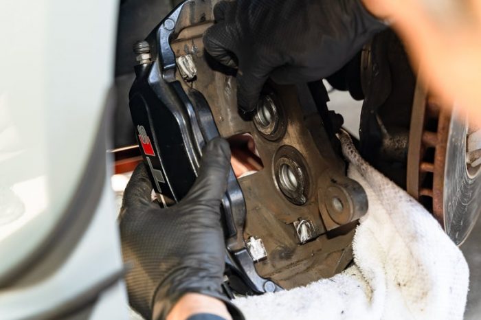ブレーキパッド、キャリパー、スライドピンなどを清掃し、ブレーキグリスを塗布します。
