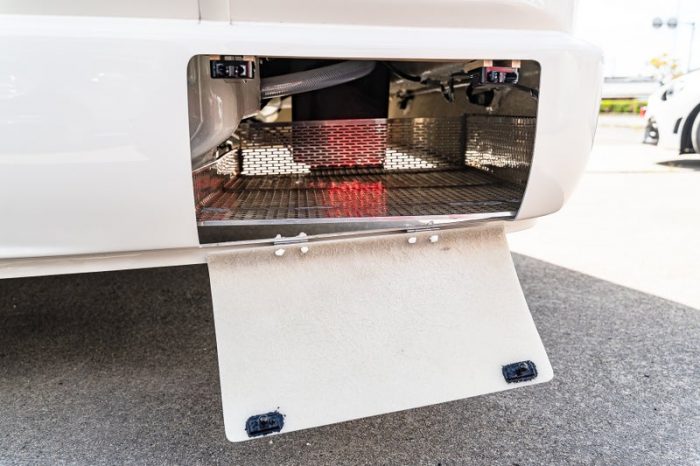 リアオーバーハング部に、簡易的に荷物を置ける外部収納庫を設けました。