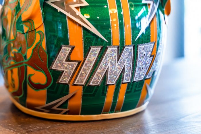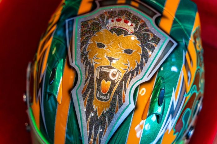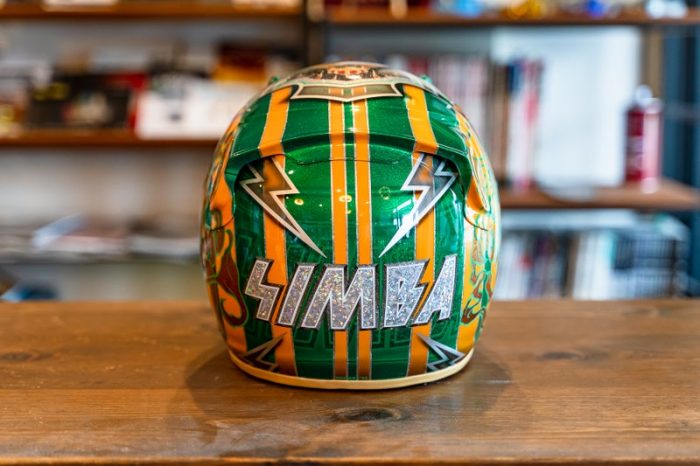 ヘルメットのテッペンには、シンバ選手のトレードマークであるライオンのイラスト!