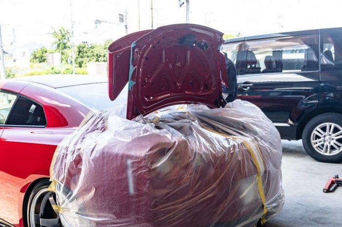 トランクの中央を基準にウイングの左右バランスを測り、マスキングテープで取り付け位置を決めます。