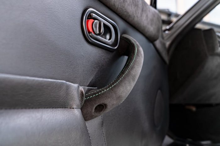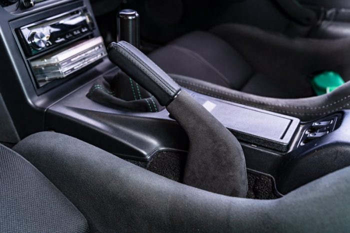 素材は、イタリアのアルカンターラ、サイドブレーキグリップのみ、イタリアの本革を使用させて頂いております。