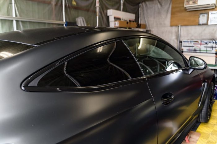 シルバーメッキ調のウインドウ周りのパーツをラッピングでブラックアウト化し、純正の「ナイトパッケージ」仕様に仕上げるカスタムです。