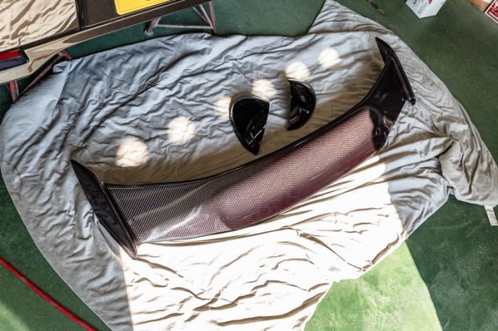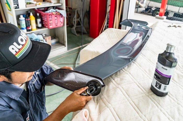 テールゲートスポイラーは翼端板部分のカーボンを残し、その他の部分はボディ同色に塗装します。