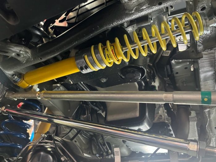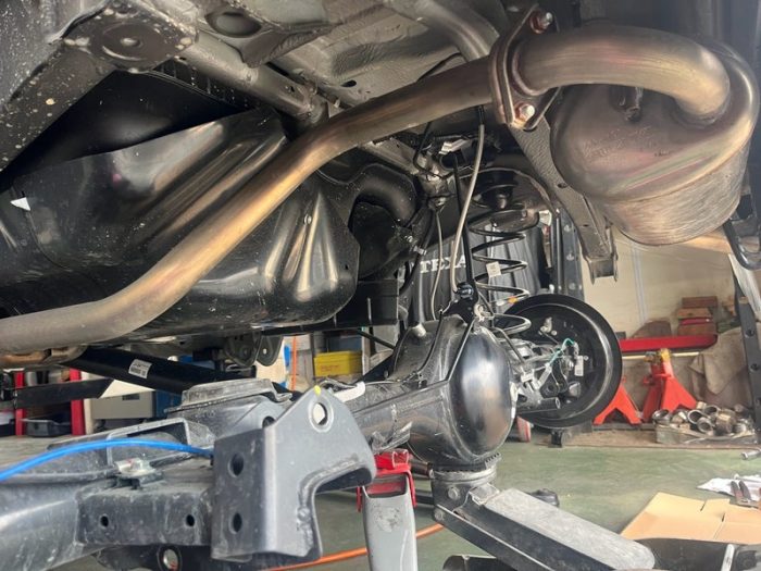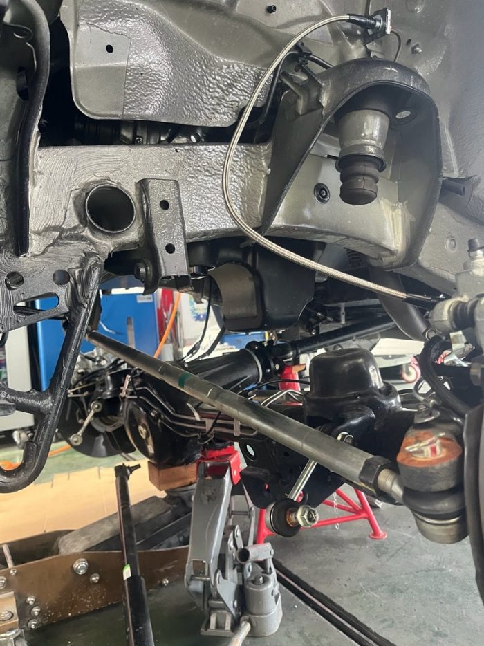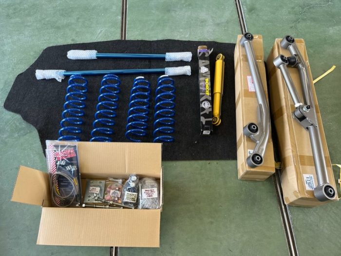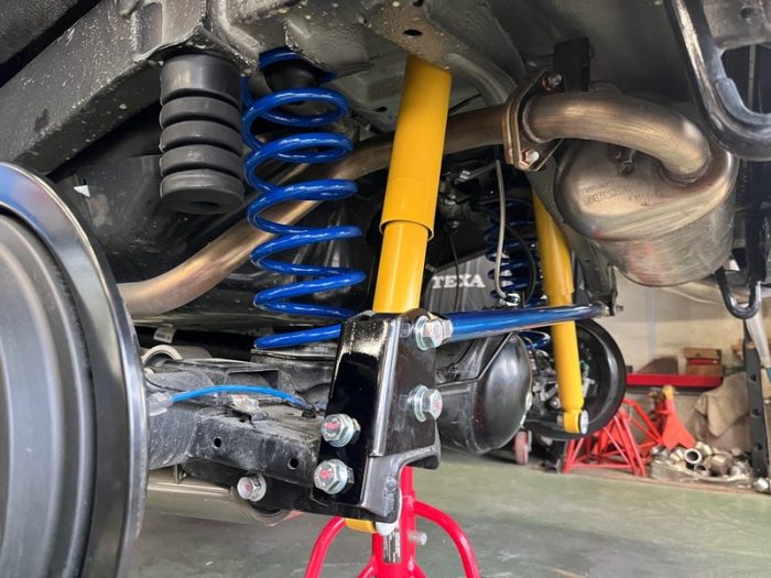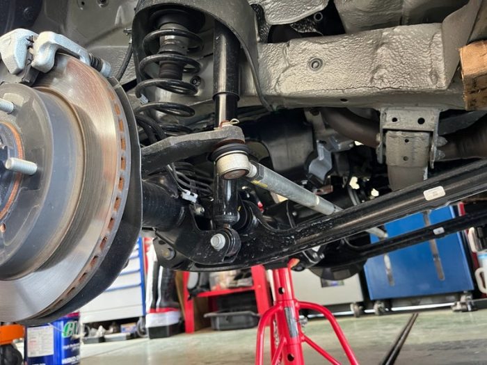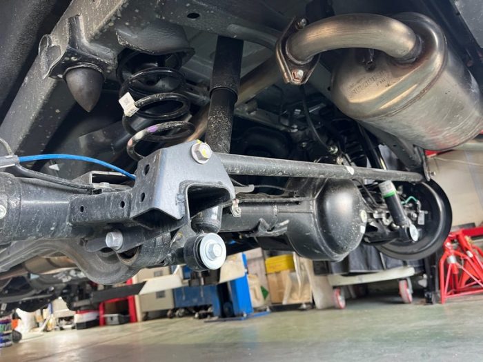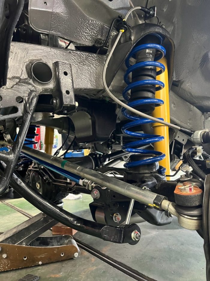 ジャッキやリフトを使って純正足廻りを外していきリフトアップキットを取り付けていきます。