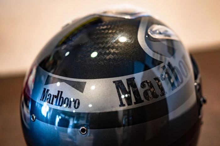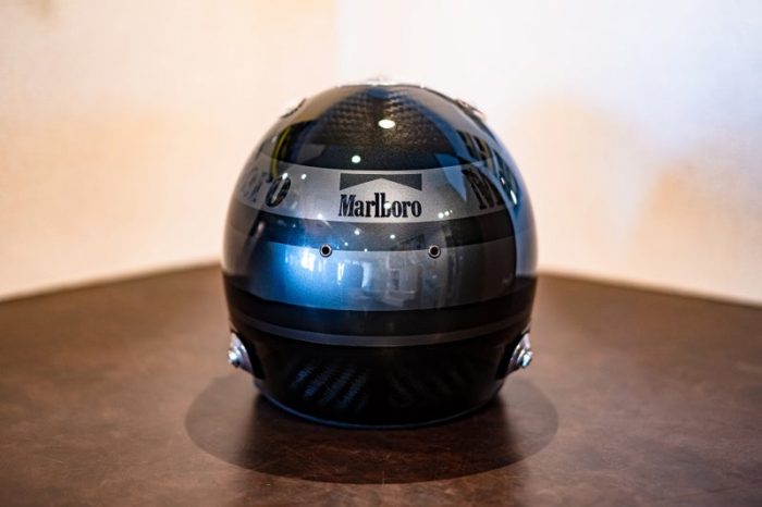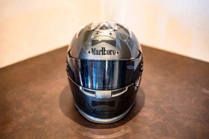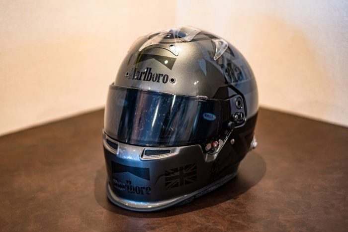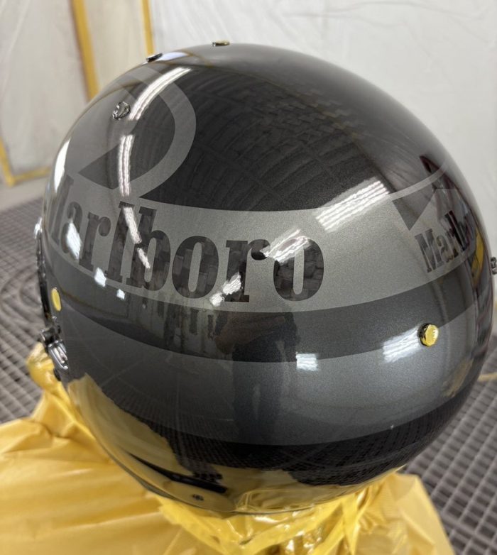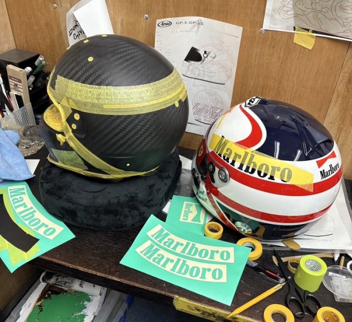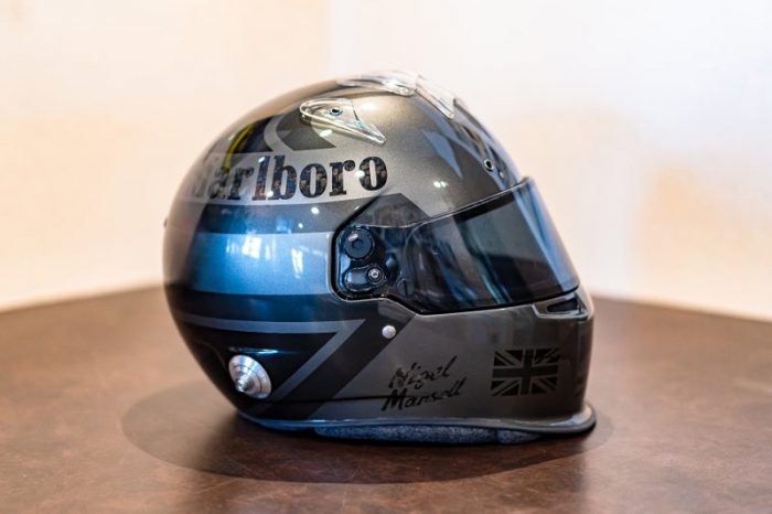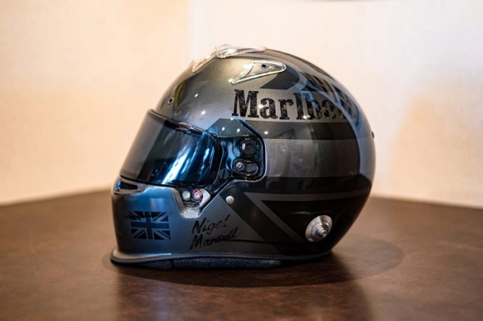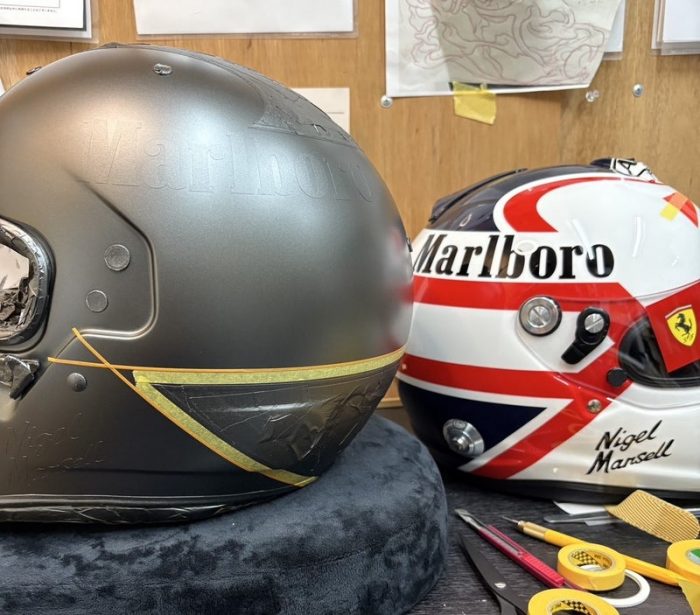 画像左のナイジェル・マンセルのレプリカヘルメットのデザインをBELLのヘルメットに落とし込んで、メタリックのモノトーンで表現しました。