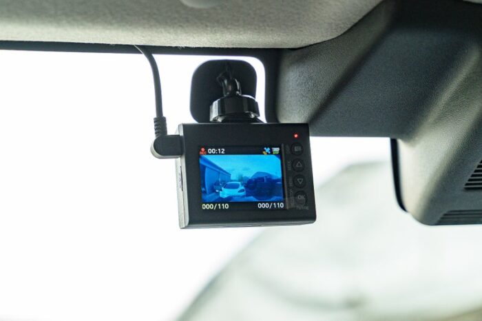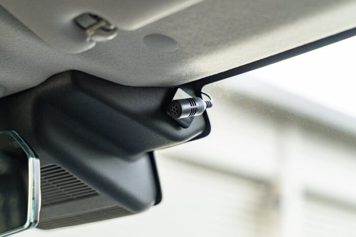 ハンズフリーなどで使用するマイクは、フロントガラス上部に貼り付けて固定しました。