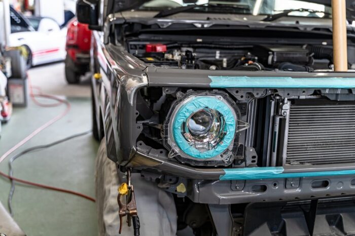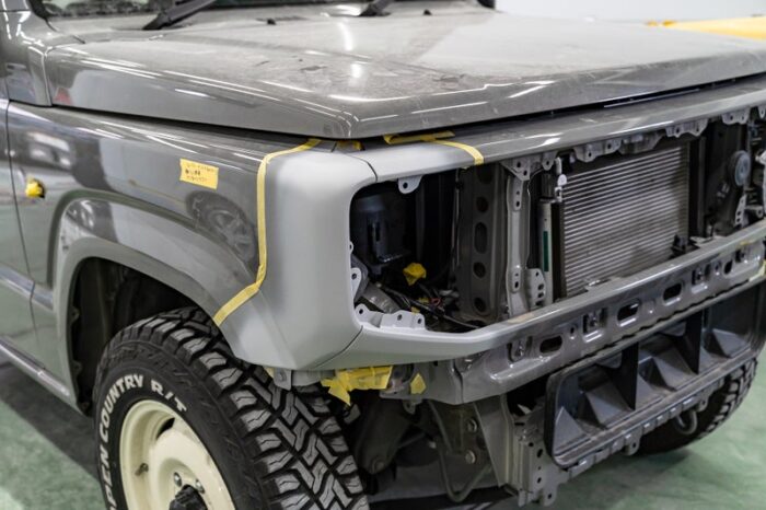 まずはフロントまわりのパーツを丁寧に取り外し、損傷箇所を確認しながら鈑金修理を行います。