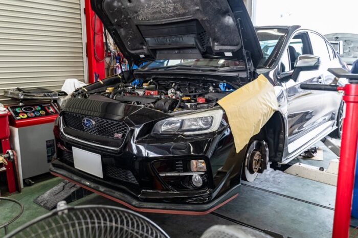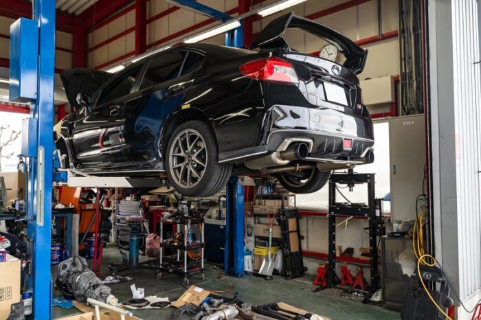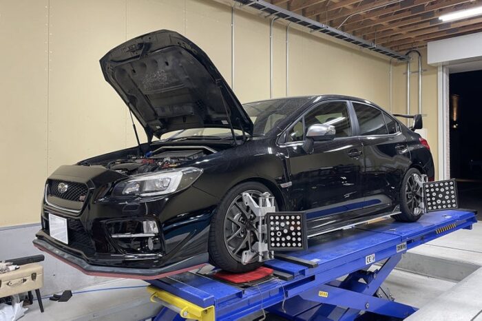 広報の原です。スバルのWRX STIが整備のためご入庫しました。