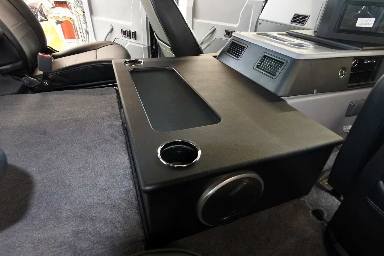 100Vコンセント、USB、シガーソケットを備えた、センターコンソールも今回の作業に合わせて、製作、レザー貼りです。