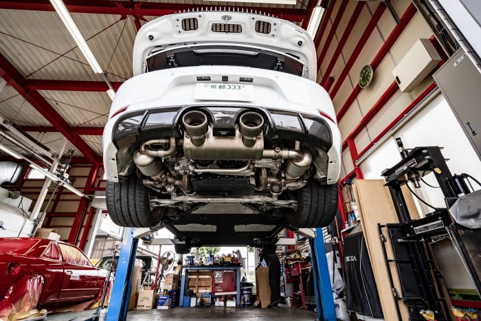カーボンディフューザーにオールチタンのマフラーの組み合わせで、レーシーに引き締まった印象を与えます。