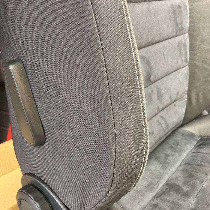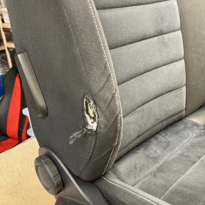 純正シートの生地に近い生地を使用して破れていた部分のみ張り替えました。擦り切れていたステッチも入れ直しています。