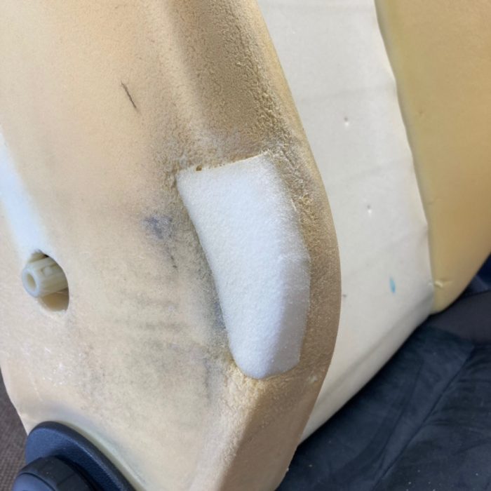 背面サイドサポート部分が破れてステッチの糸も擦り切れている状態でした。ホールド性のあるシートですが、その分乗り降りの際のシートへの負担も大きいです。