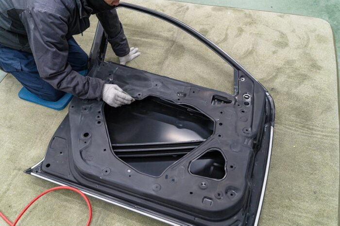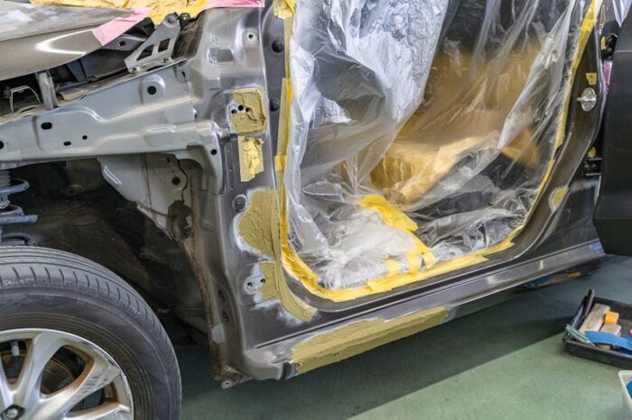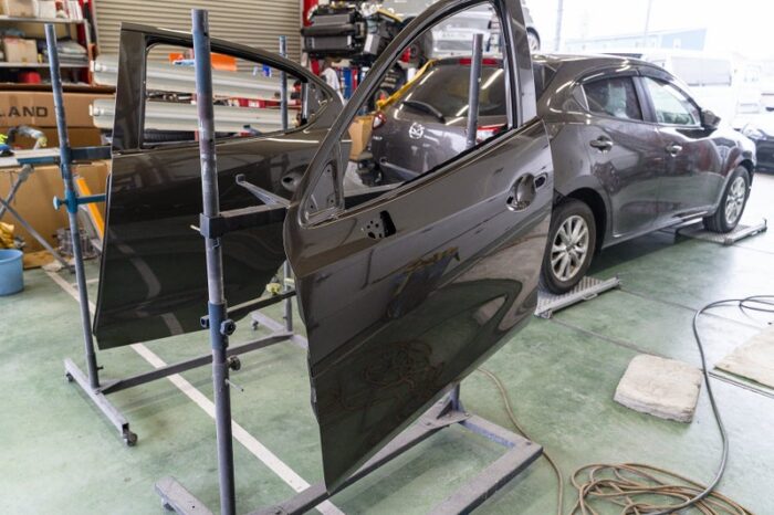 助手席側のドアを中心に、リアドアとフェンダーなど左側面全体を修理していきます。