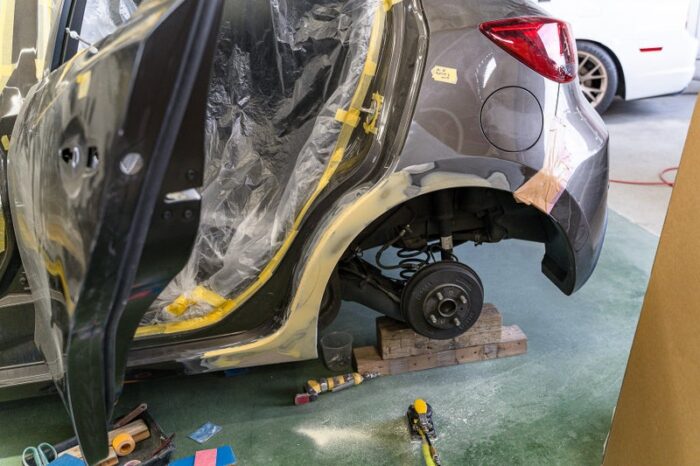 鈑金作業にて修理後のロッカーパネルやリアフェンダーにパテ薄くを塗って整形します。