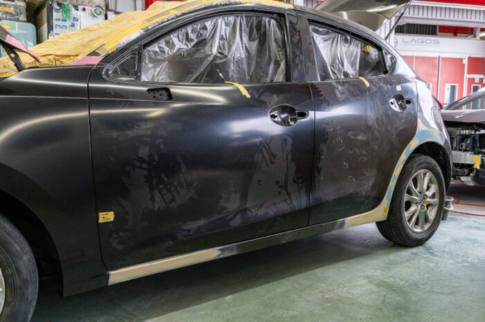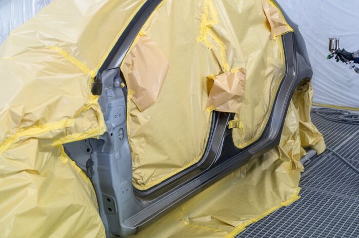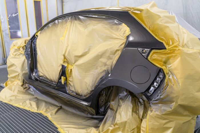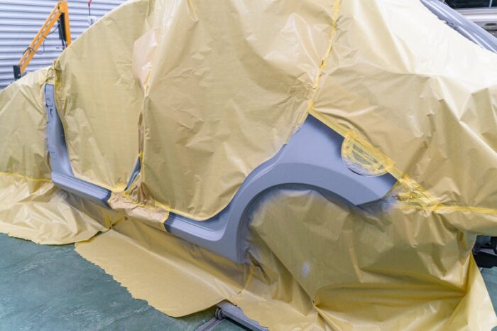 車両を塗装ブースに移し、ボディ同色に塗装していきます。