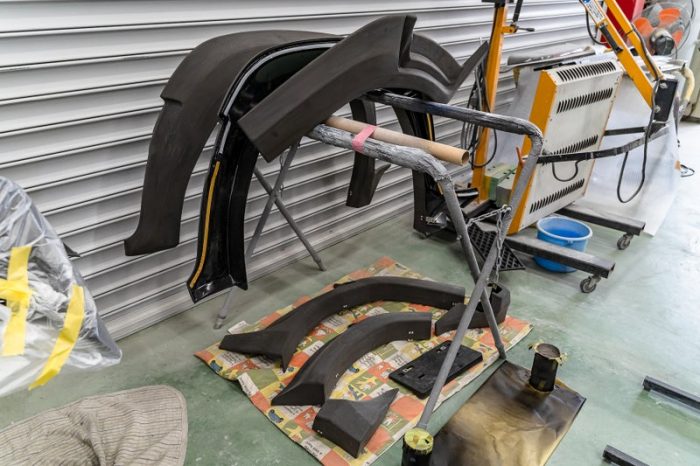 各パーツをボディ同色で塗装していきます。 部品点数が多く、形状も複雑なので丁寧に作業していきます。