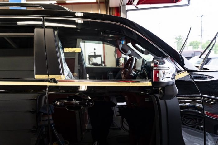 クロームのウインドウモールとドアハンドルに黒のラッピングフィルムを貼っていきます。